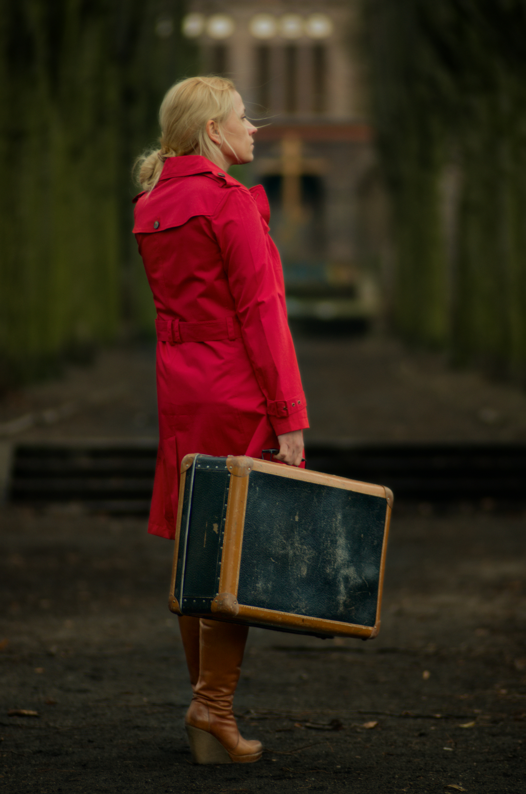Etykietybag czerwień dziewczyna girl kobieta kolej pkp podróż railroad red travel waiting walizka walking woman